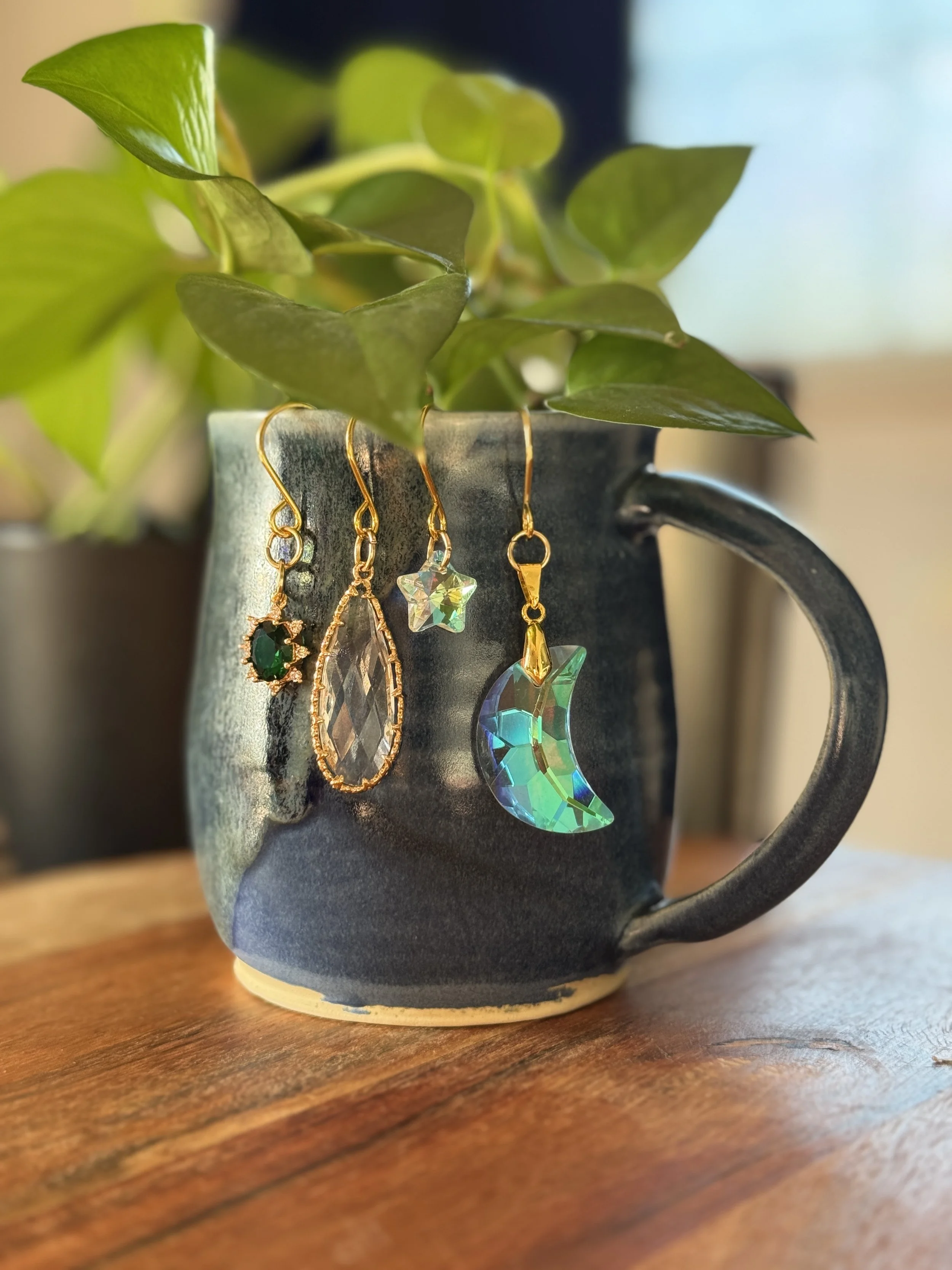 made with: large Aurora borealis crescent moon pendant, large faceted crystal star pendant, metal ring, chain, charms, beads